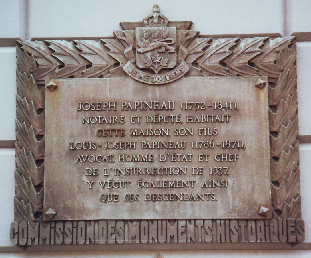 "Joseph Papineau (1750-1841) notaire et député, habitait cette maison. Son fils Louis-Joseph Papineau (1785-1871), avocat, homme d‘état, et chef de l‘insurrection de 1837, y vécut également ainsi que ses descendants." C.M.H.Q.