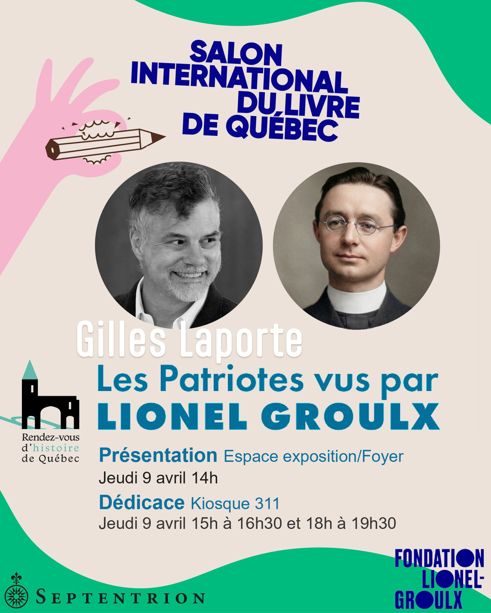 Les patriotes vus par Lionel Groulx 1926-2026. Lire Groulx à un siècle de distance – le clergé et la mémoire des patriotes – le grand crime des patriotes selon Groulx – Groulx sur le rapport Duham et le destin du Canada. Salon du livre de Québec. Stand Septentrion. Centre des congrès de Québec, 1000, boul. René-Lévesque E.